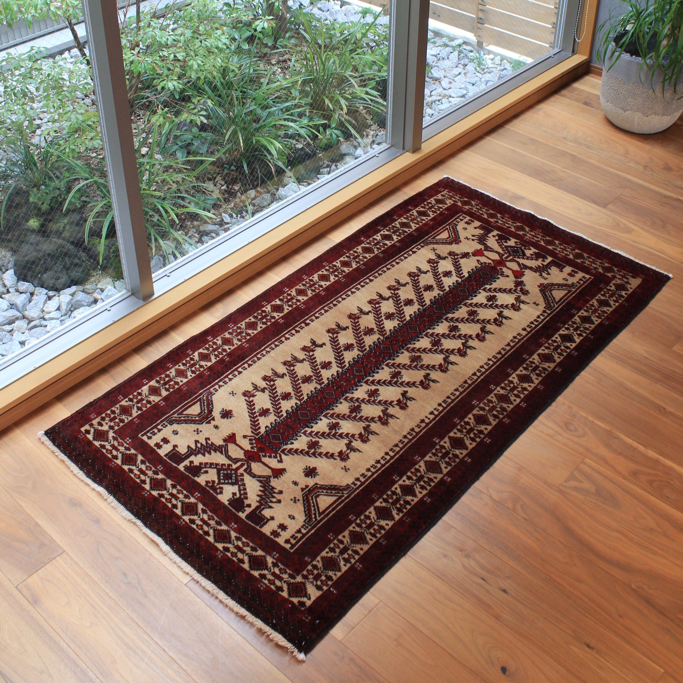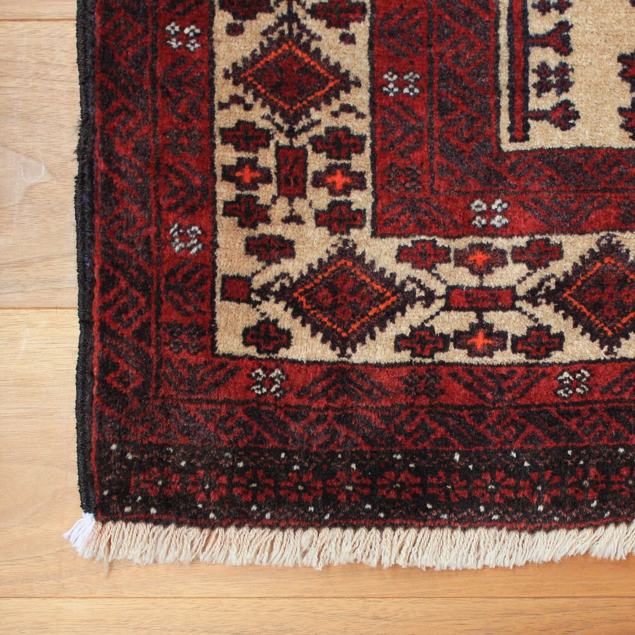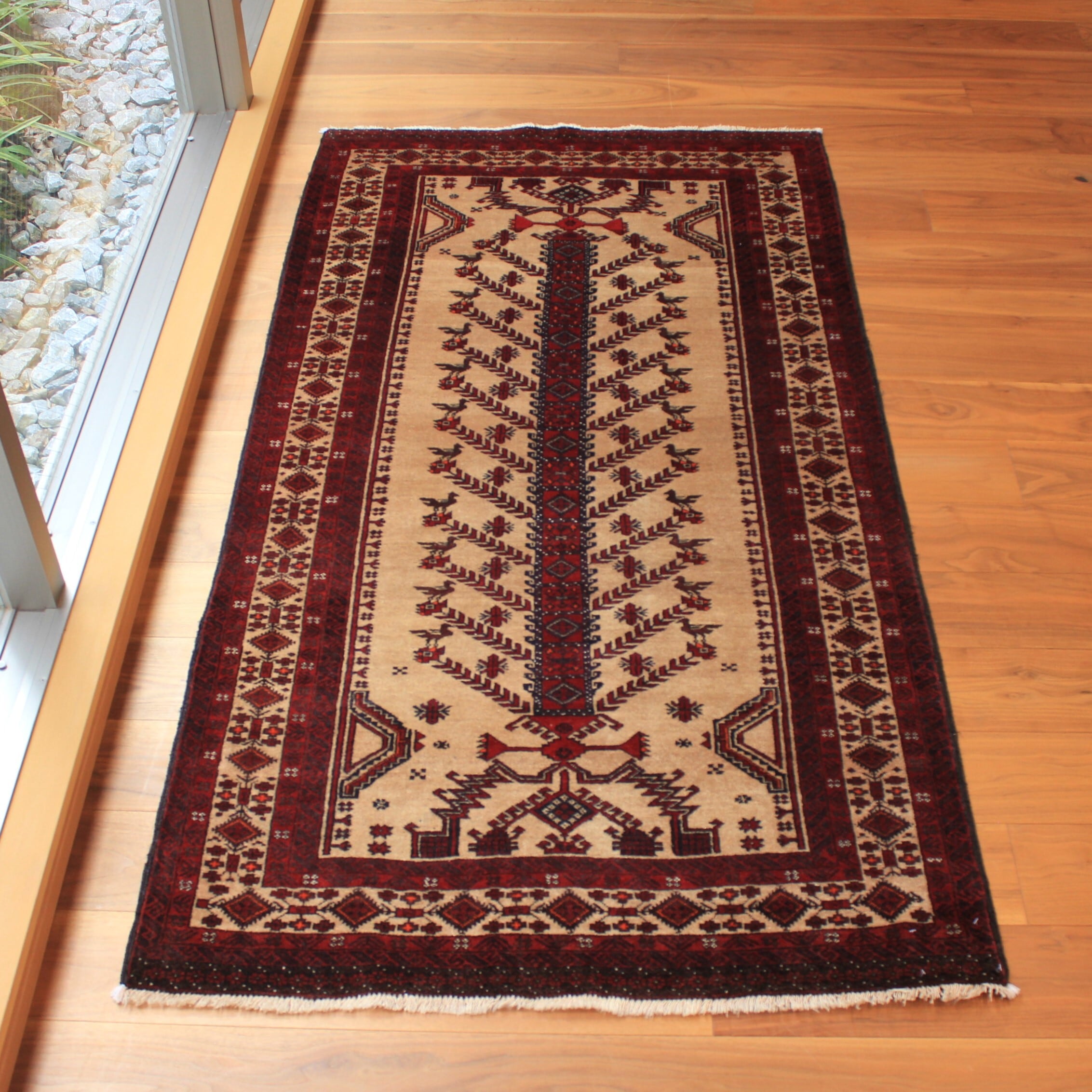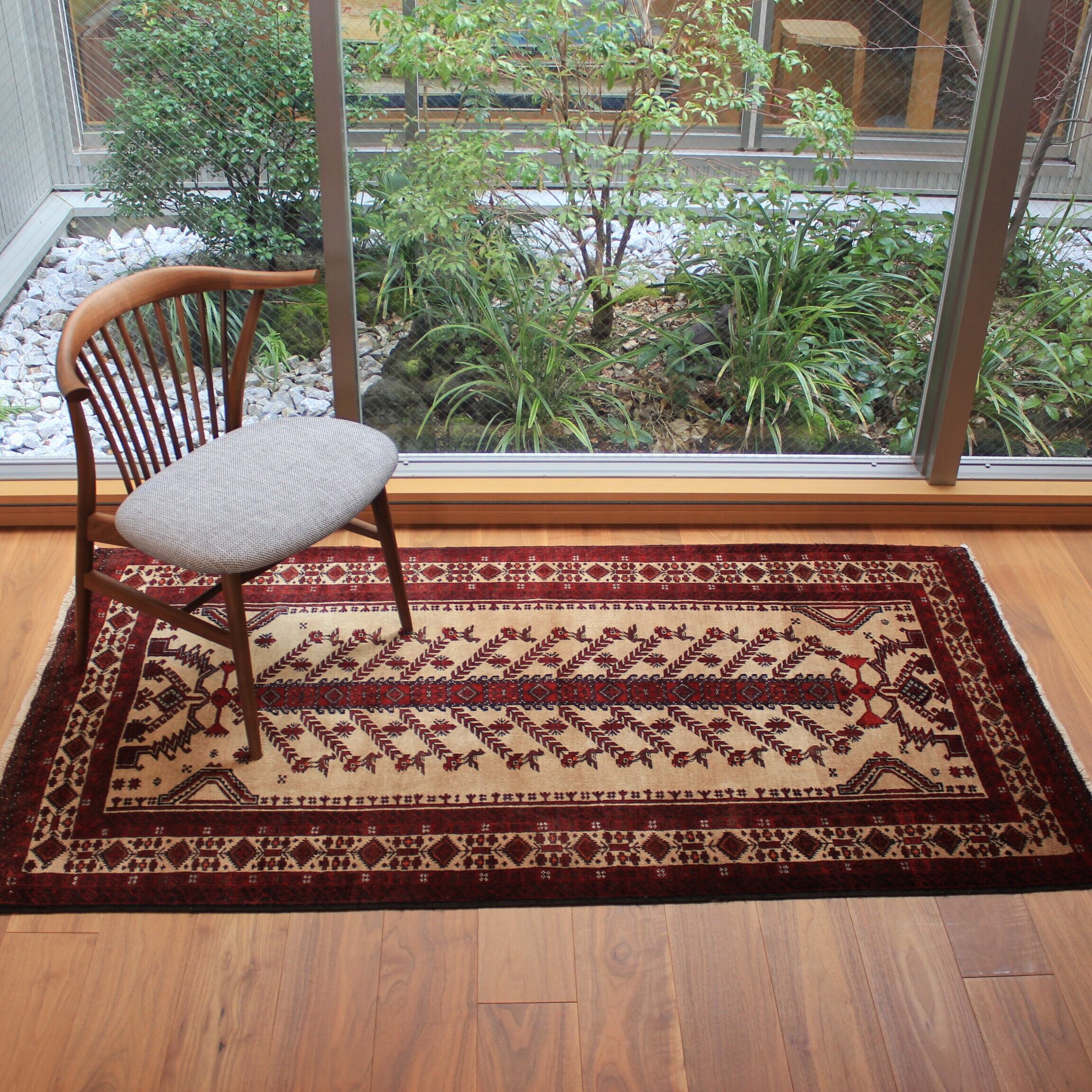 バルーチ絨毯は、イラン東部からアフガニスタン西部にかけて暮らすバルーチ族によって織られます。深みのある赤や藍、茶色などの落ち着いた色合いと細かな幾何学模様のパターンが特徴で、日本のお部屋にもよく馴染みます。