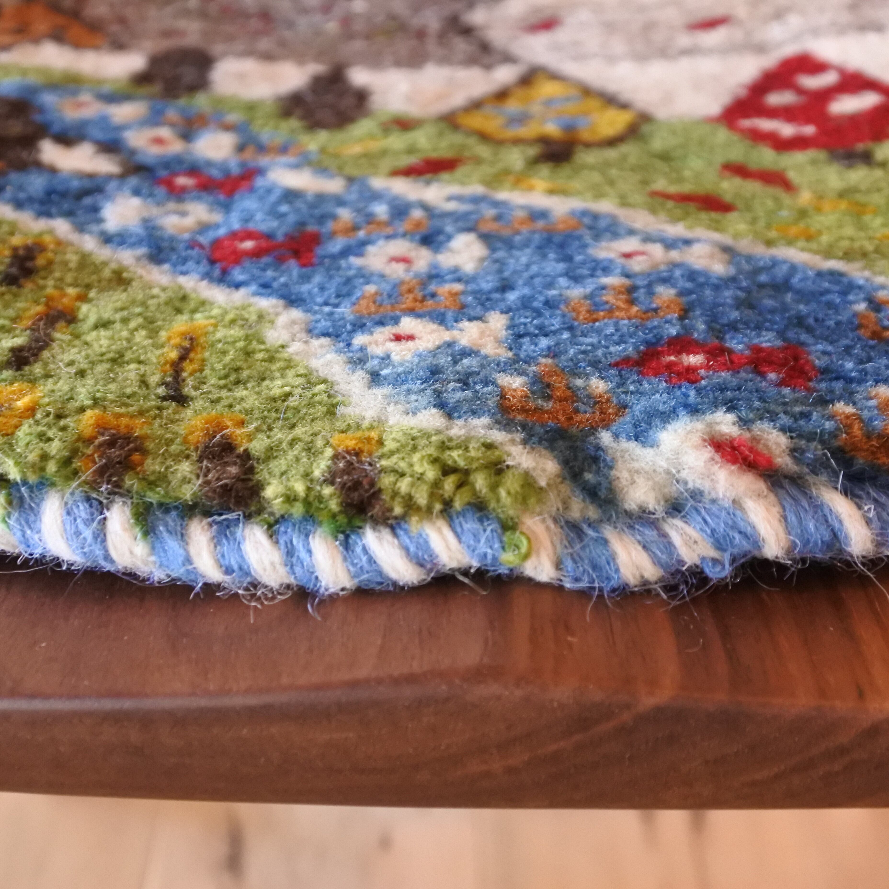 私たちの扱う手織り絨毯は全て人の手によって作られるので機械織りの絨毯のような完璧さはありません。色ムラや柄の歪み、ねじれなど不完全なところもありますが、その大らかで素朴な味わいこそが本来の手織り絨毯特有の”個性”であり、”魅力”でもあります。手織り絨毯の特性をご理解の上、ご購入くださいませ。