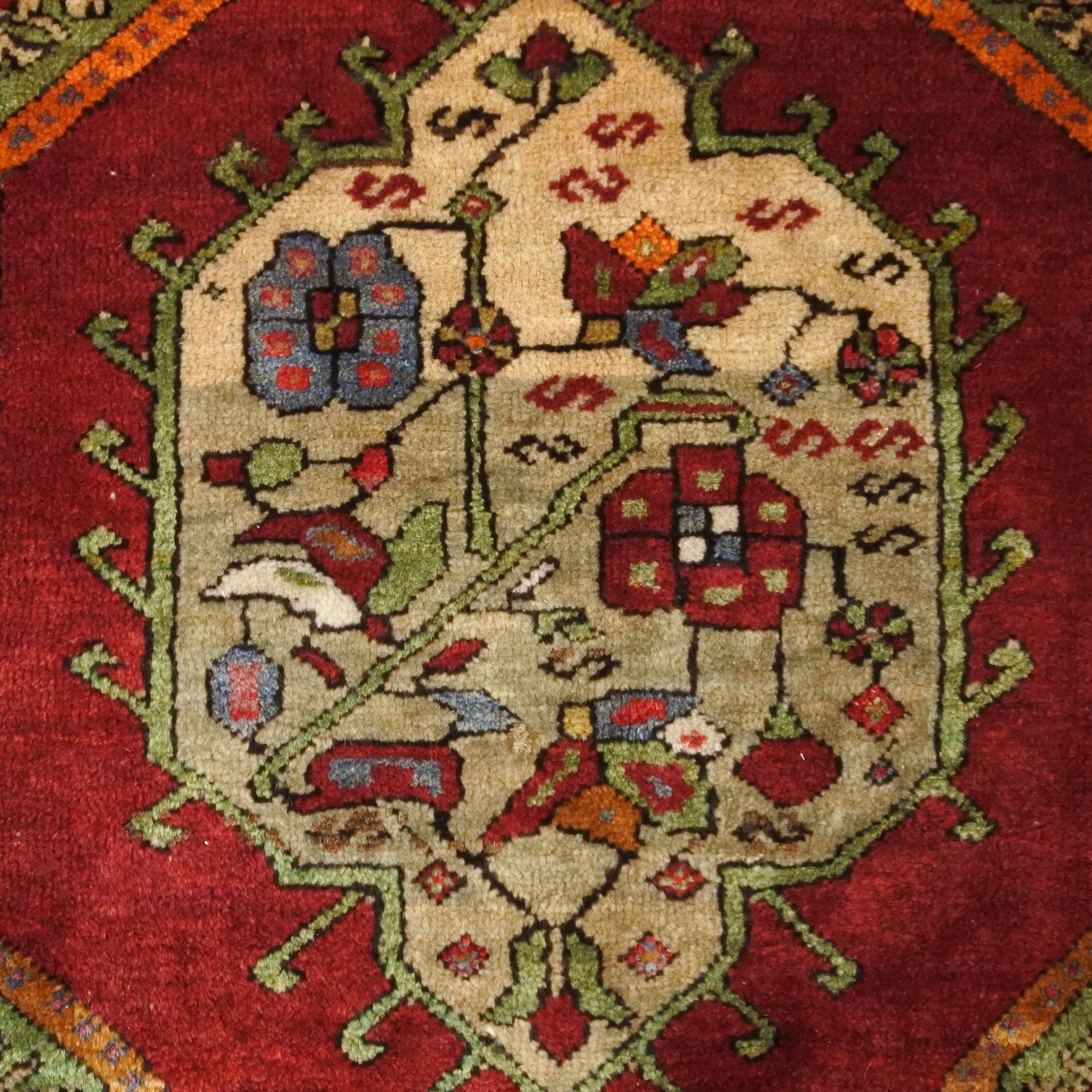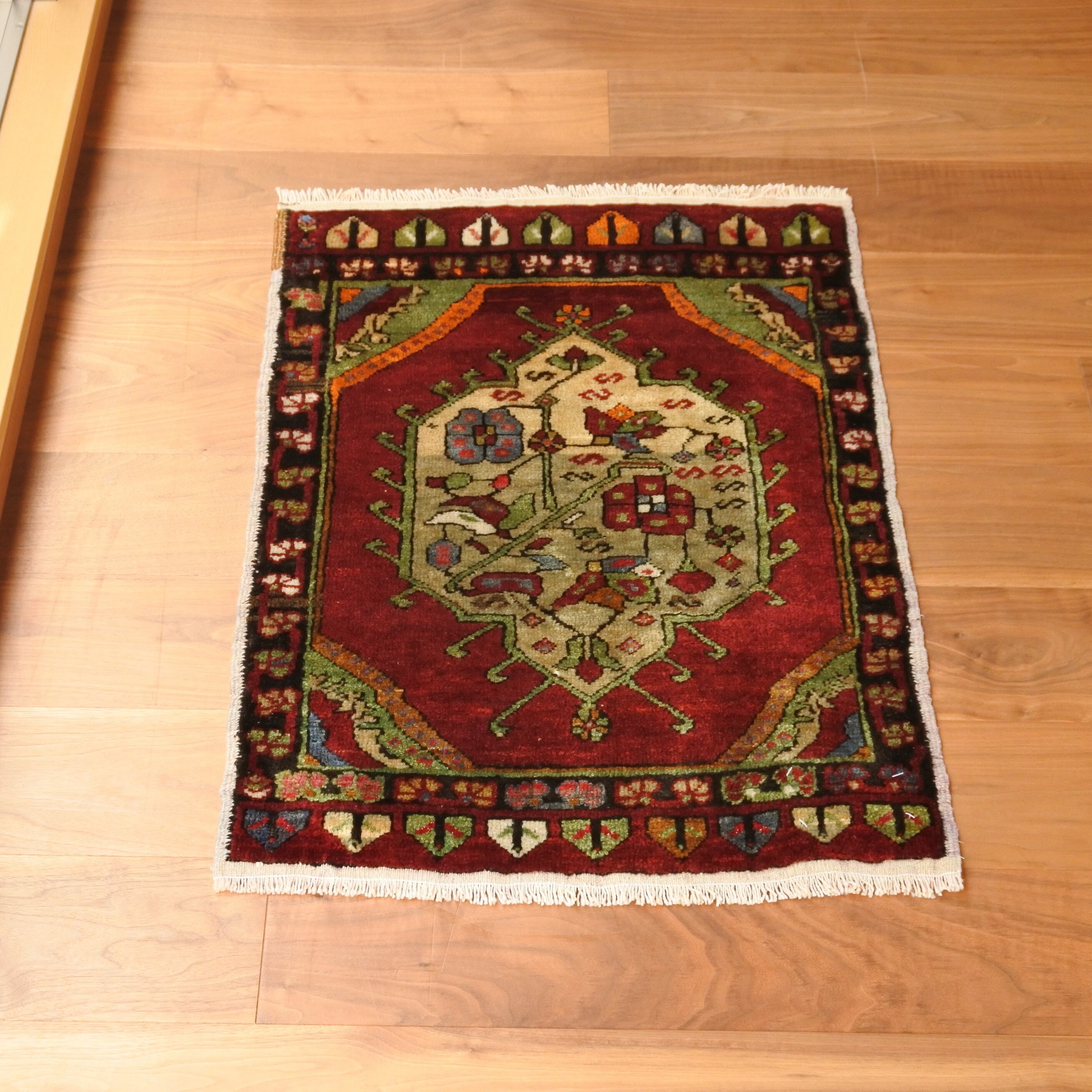 深みのある渋い色合いと、優雅な花が美しい一枚。抽象と具象のバランスが魅力的です。薄く軽いため、ラグとしてだけでなく壁掛けなどにもおすすめです。