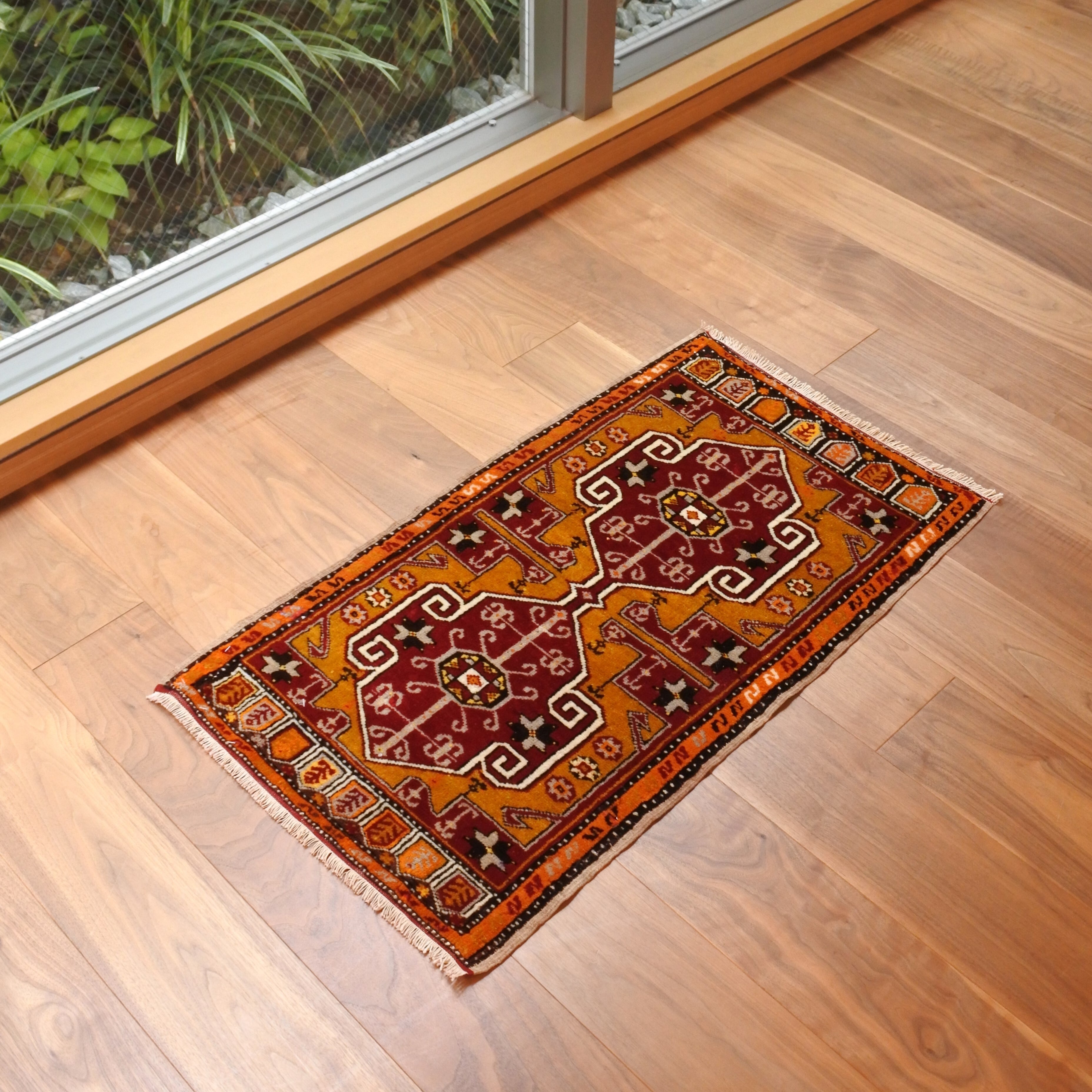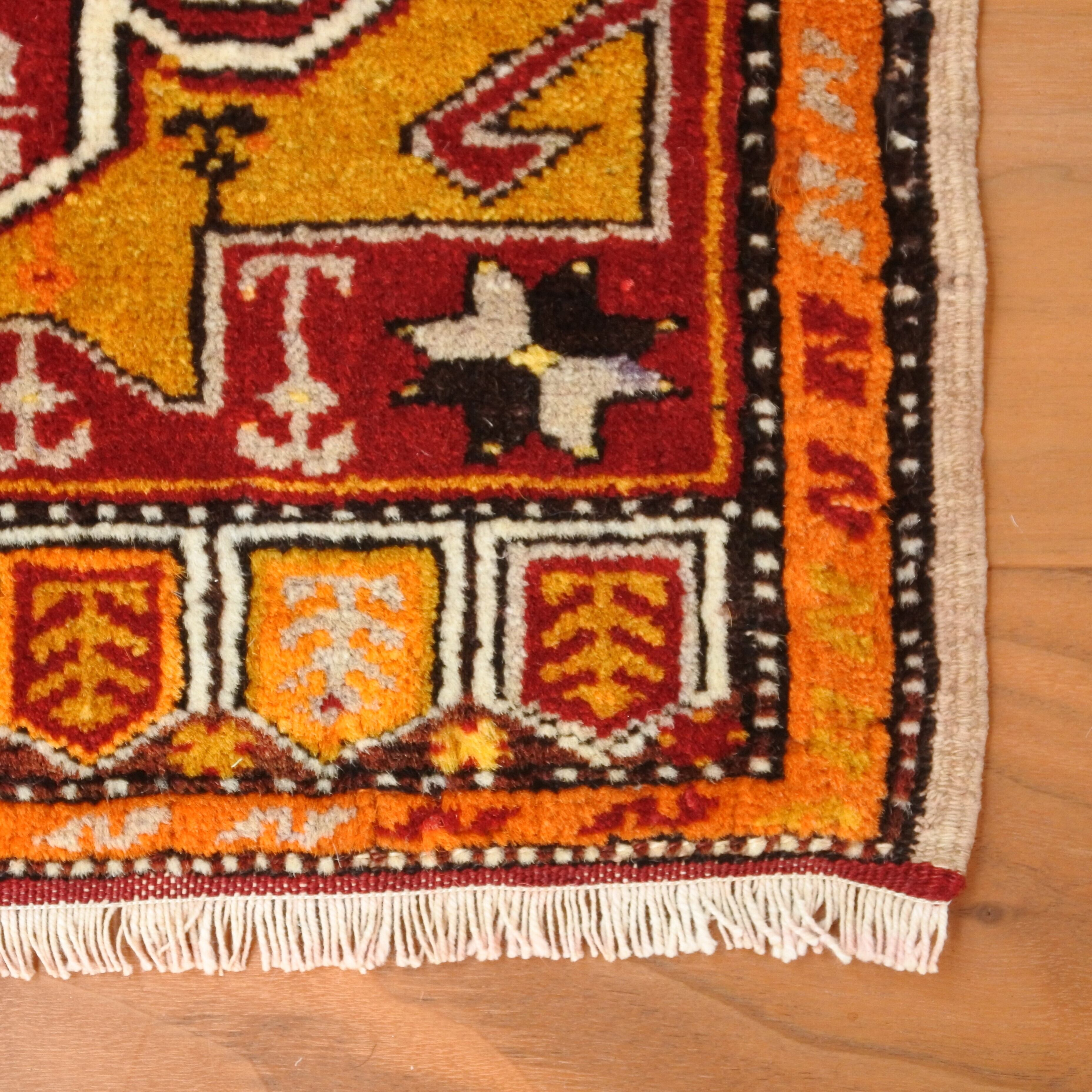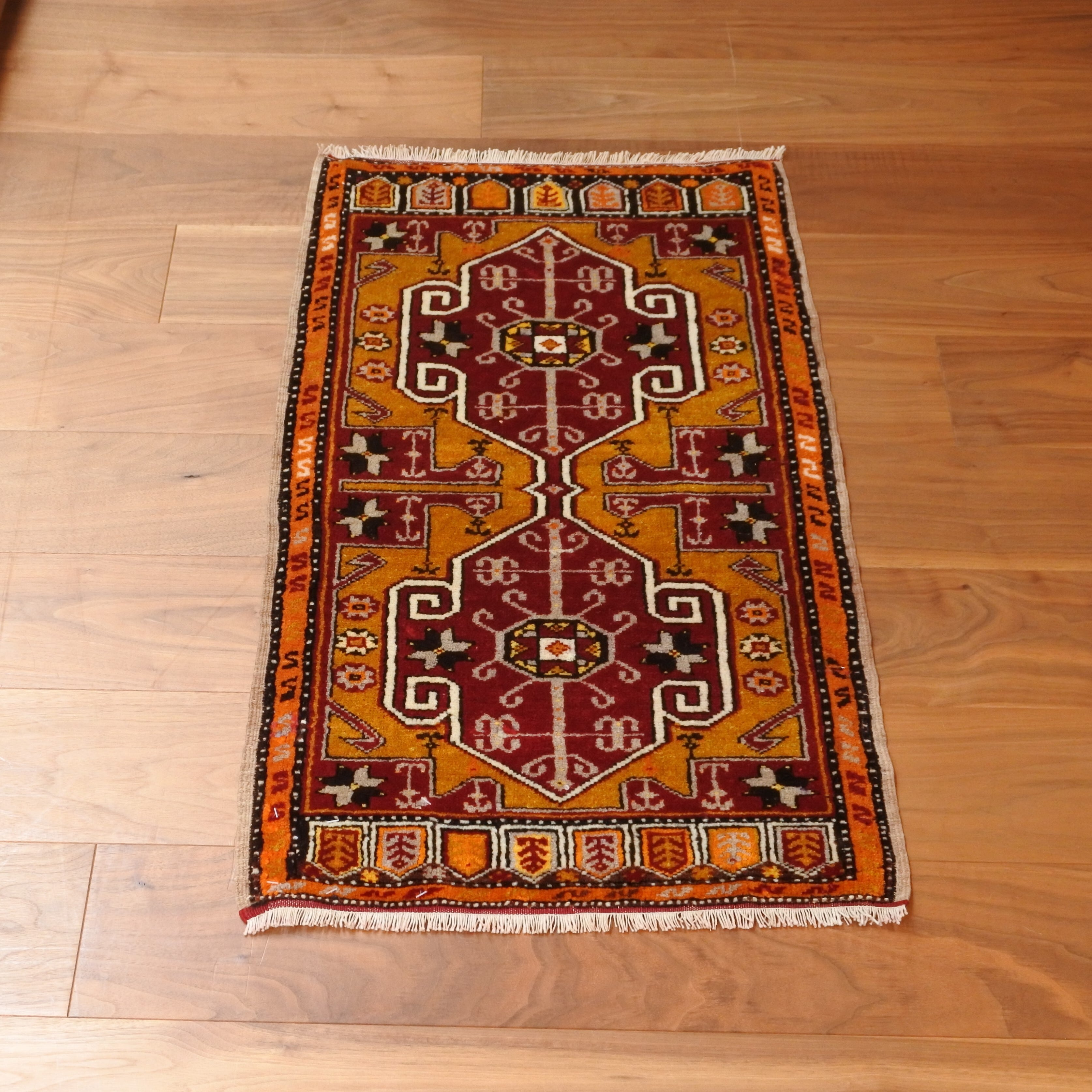 イスラム文化が深く根付いた歴史ある街、コンヤで織られた絨毯。願いを込めた大胆で抽象的な幾何学模様が魅力な一枚です。薄く軽いため、ラグとしてだけでなく壁掛けなどにもおすすめです。