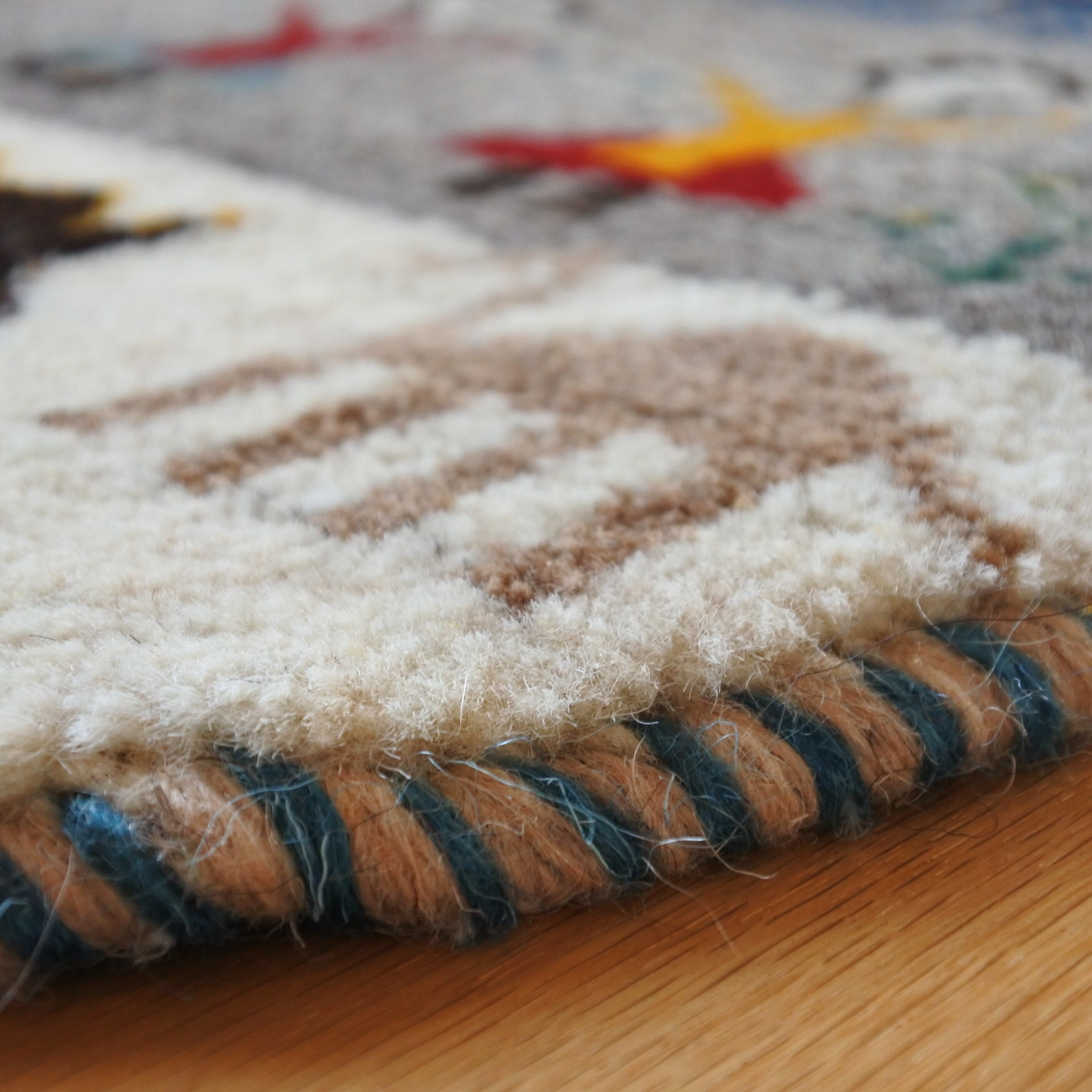 私たちの扱う手織り絨毯は全て人の手によって作られるので機械織りの絨毯のような完璧さはありません。色ムラや柄の歪み、ねじれなど不完全なところもありますが、その大らかで素朴な味わいこそが本来の手織り絨毯特有の”個性”であり、”魅力”でもあります。手織り絨毯の特性をご理解の上、ご購入くださいませ。